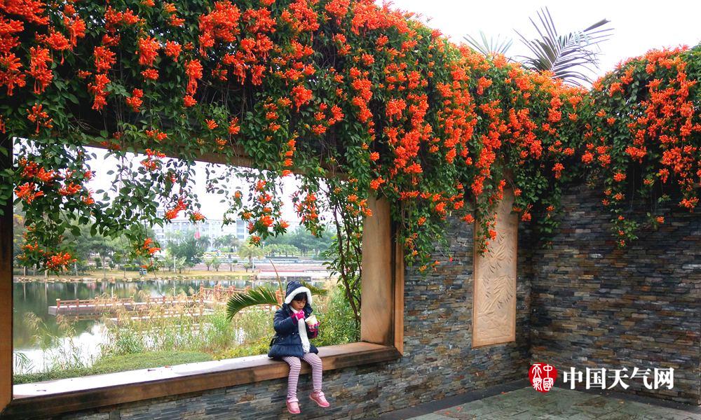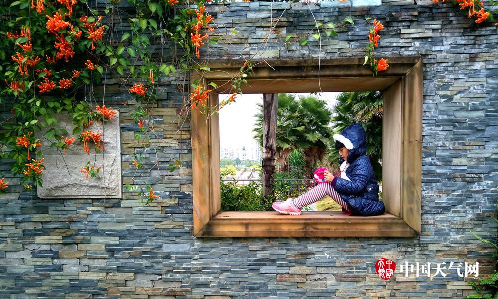 一身冬装的小姑娘坐在花墙上玩耍。(摄影:周冬静)