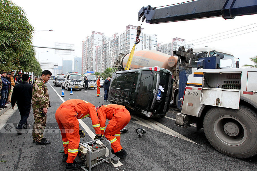 事故现场,交警、消防人员在对事故车辆进行解救。(摄影:邓昶)