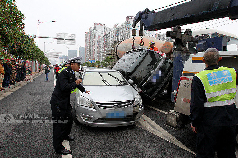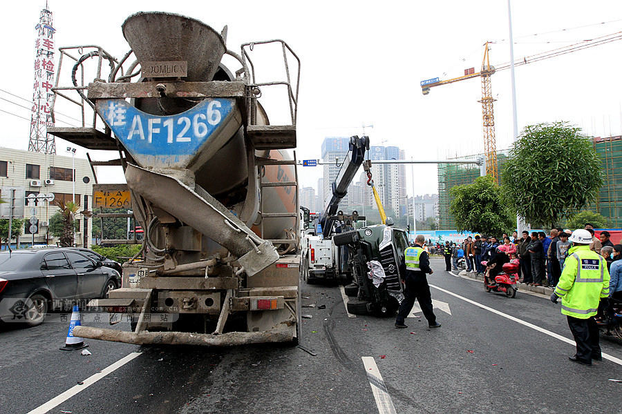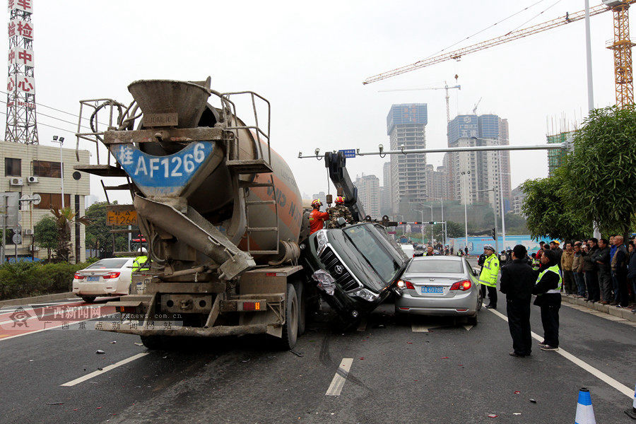 事故现场,一辆越野车被撞得180度旋转,侧压在旁边的小车身上。(摄影:邓昶)