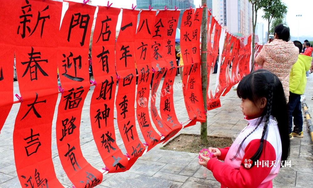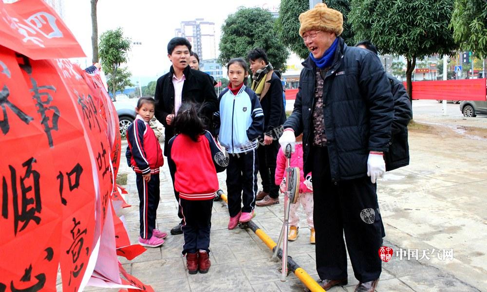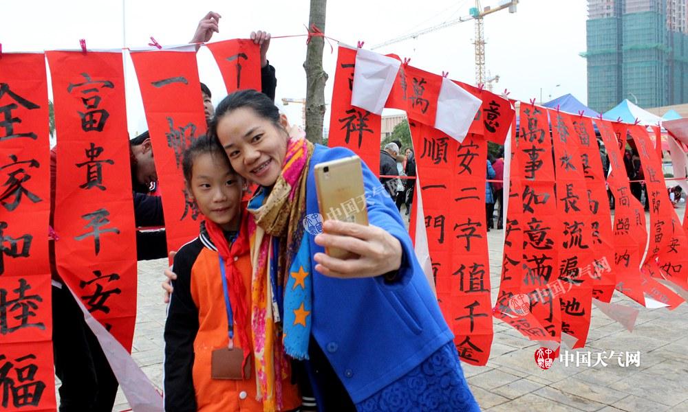 看上对联的市民朋友和小书法家自拍留念(摄影:周冬静)