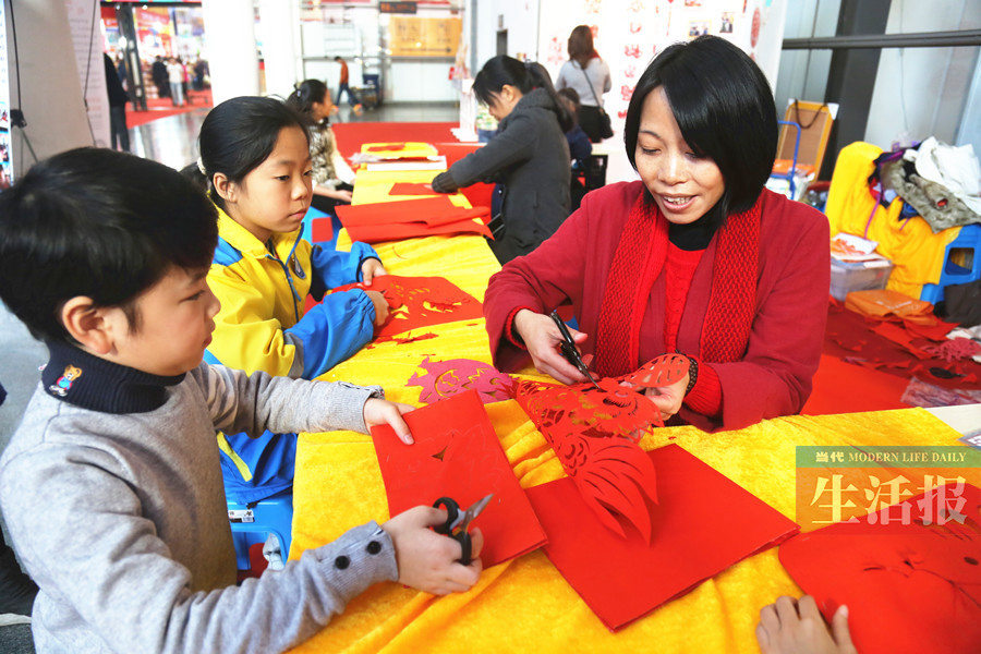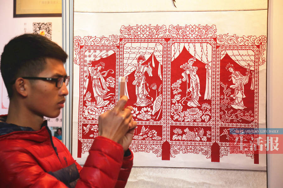 近日在南宁国际会展中心大厅内,一幅10米长的鸡年主题剪纸长卷亮相,引起关注。这是曾多次获全国大奖的民间工艺师钟昀睿的作品,她前后花了1个月时间设计、调整和剪纸,终于将这幅长卷呈现在市民面前。记者 徐天保 摄(广西新闻网-当代生活报)
