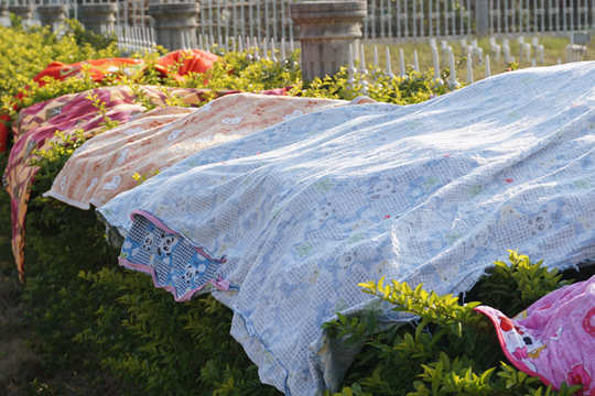 拿到福字的小朋友和妈妈在服务站休息。(摄影:李斌喜)