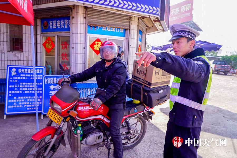 钦州市交警支队二大队民警为摩托返乡人指路。(摄影:李斌喜)