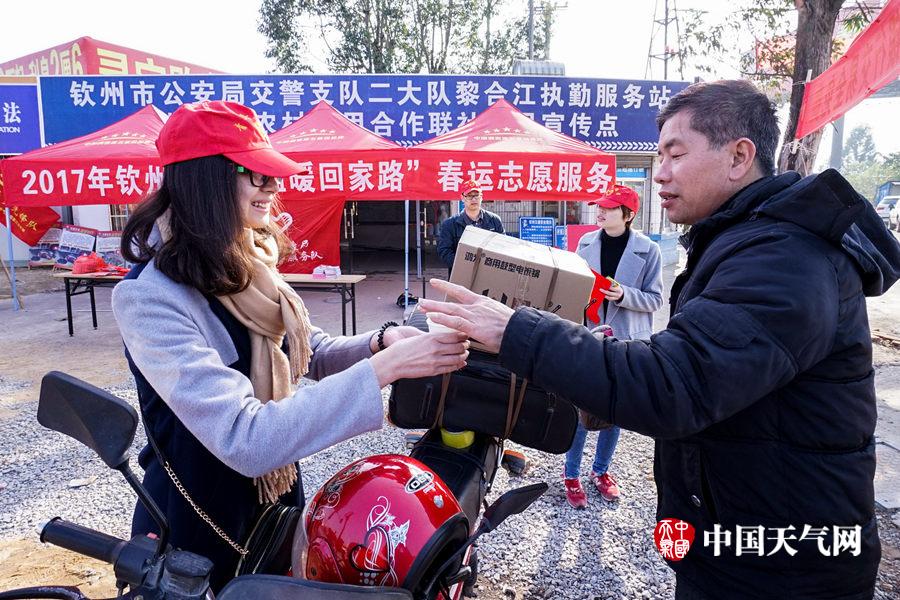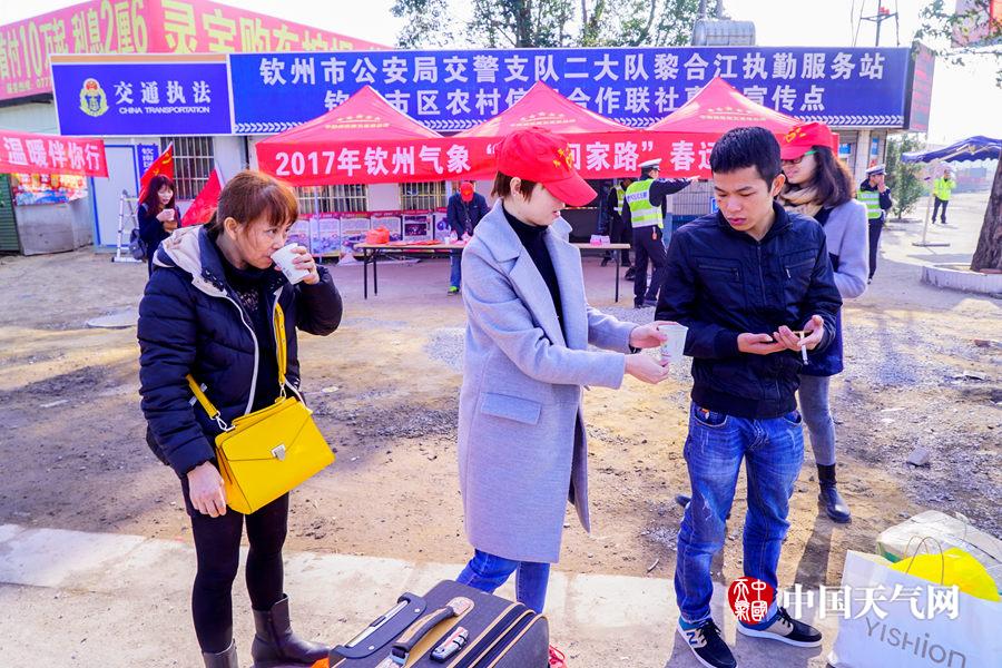2017年1月22日上午,钦州市气象局青年志愿者为返乡摩托群众递上暖暖的热姜茶。(摄影:李斌喜)