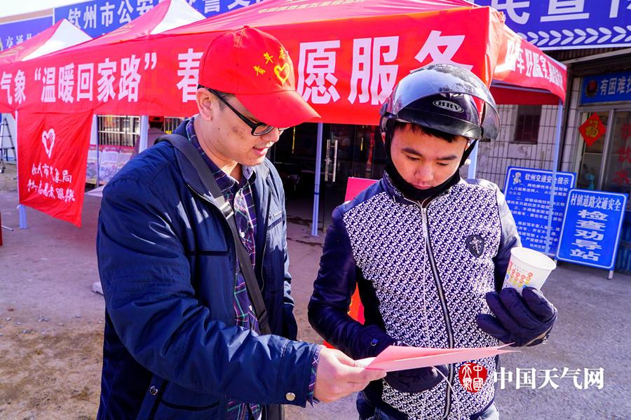 青年志愿者向摩托返乡人介绍春运天气情况。(摄影:李斌喜)