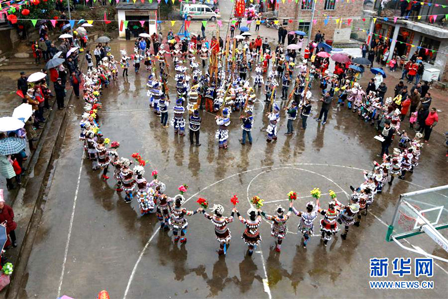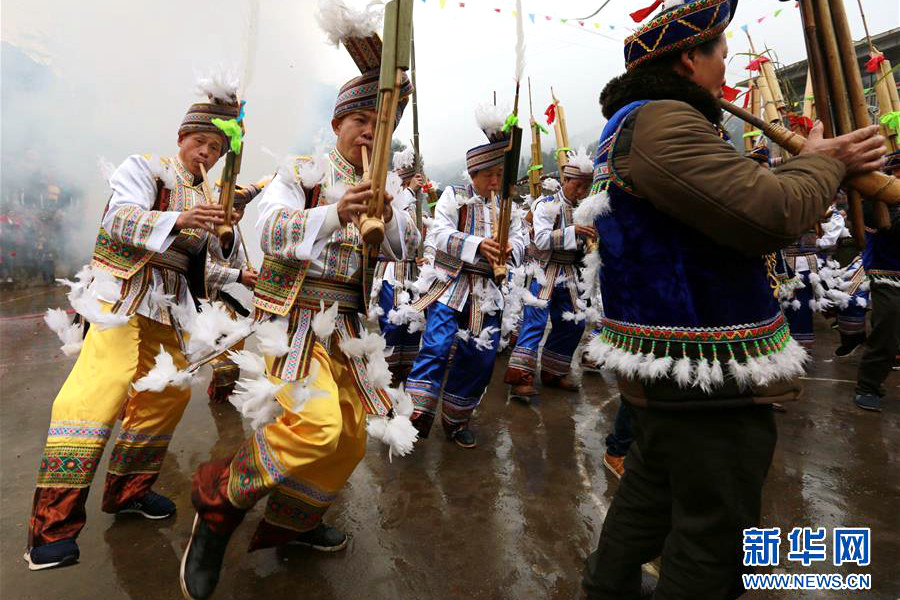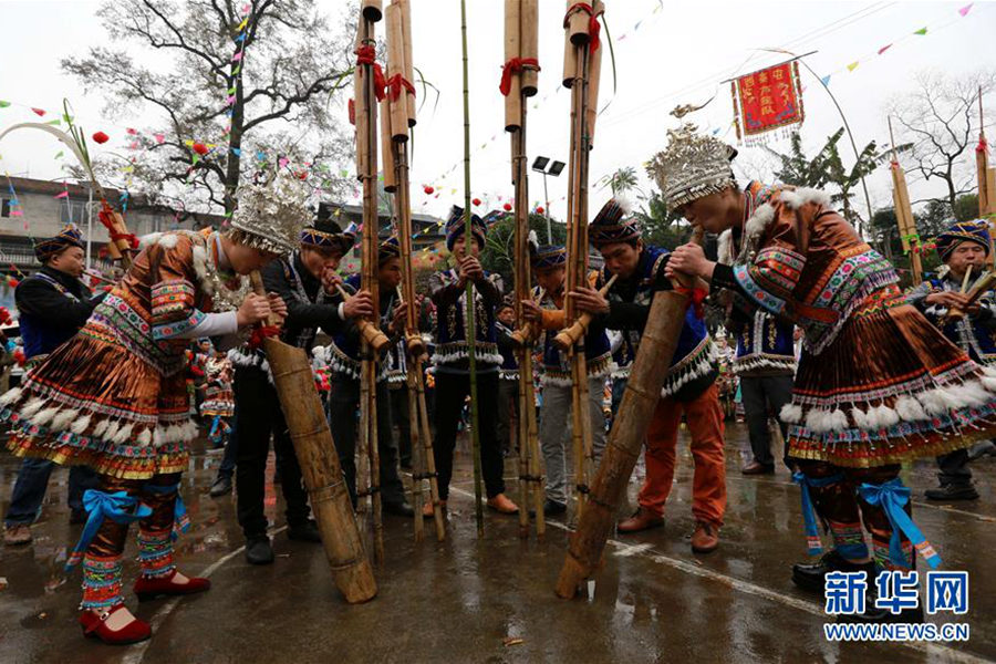 2月3日,在广西柳州市融水县西寨屯,侗族群众在“热伴”活动中表演吹芦笙。