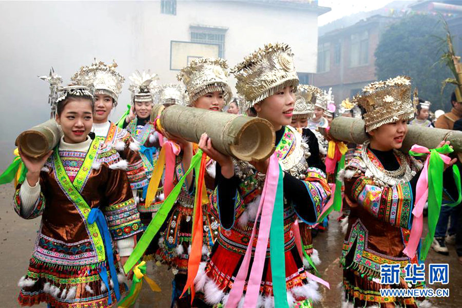 2月3日,在广西柳州市融水县新村屯,侗族群众在“热伴”活动中扛着芦笙筒围同伴。