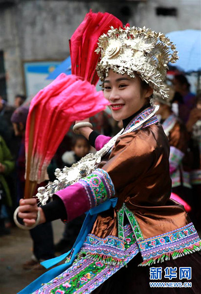 2月3日,在广西柳州市融水县新村屯,一名侗族姑娘在“热伴”活动中跳芦笙舞。