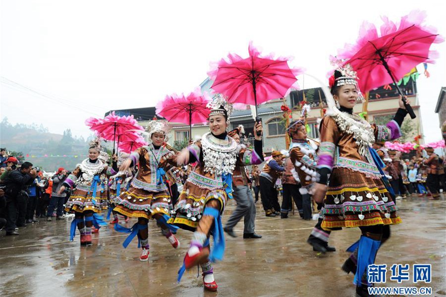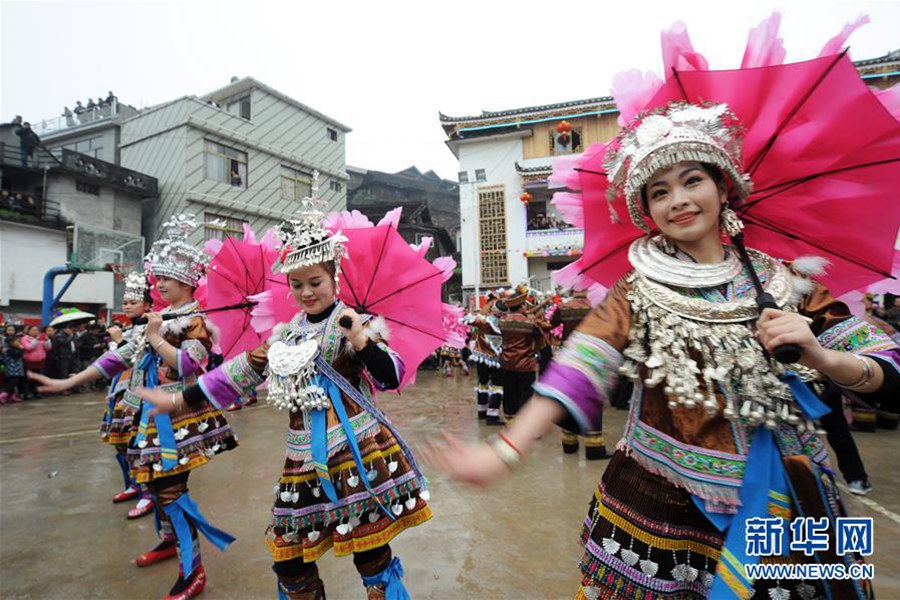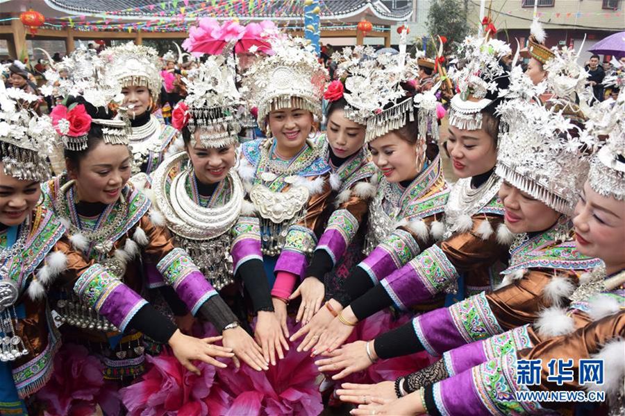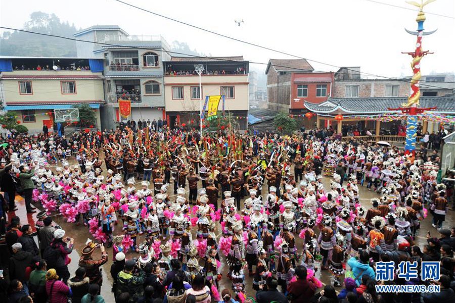 2月7日,在广西融水苗族自治县安太乡林洞村培科屯,当地群众载歌载舞。(摄影:李斌)