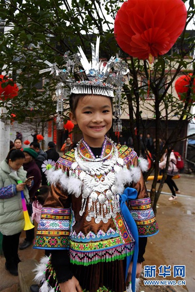 2月7日,一名苗族儿童在广西融水苗族自治县安太乡安太中心小学等待参加“打同年”活动。(摄影:李斌)