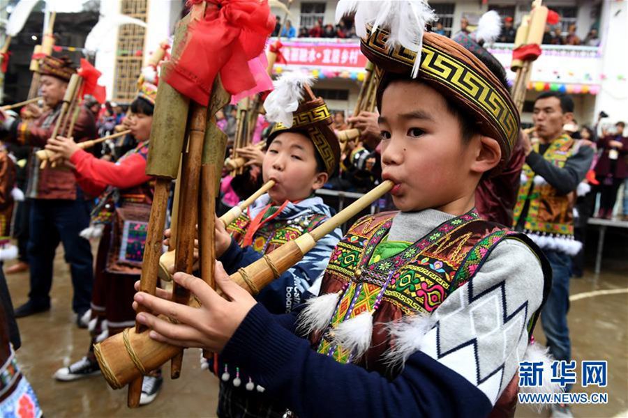 2月7日,在“打同年”活动中,两名苗族少年在吹奏芦笙为活动助兴。(摄影:李斌)