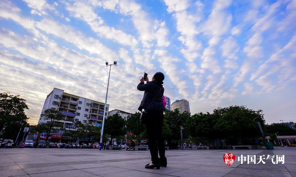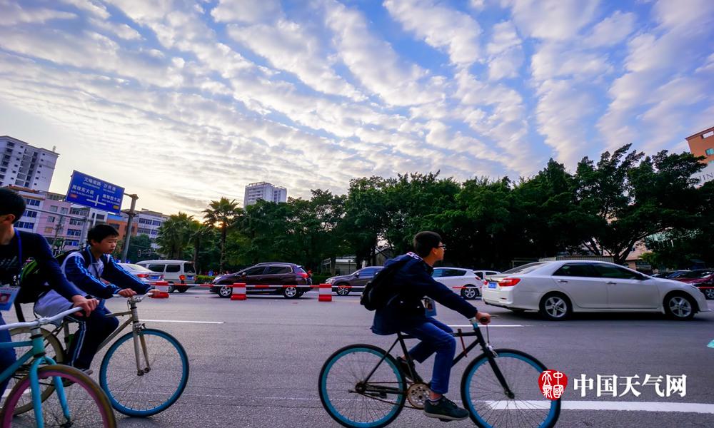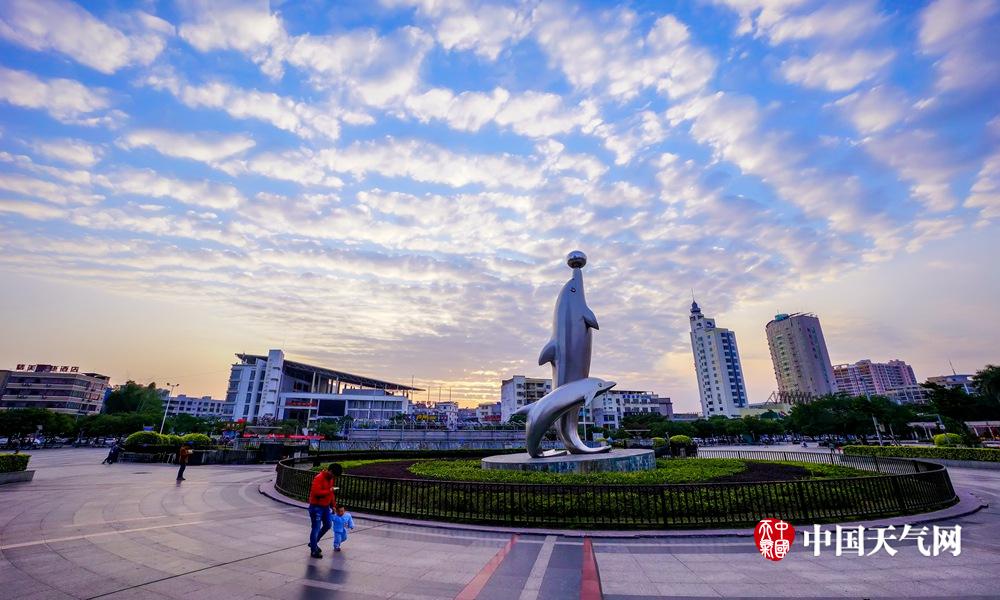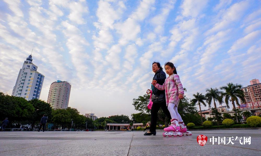 14日下午,钦州市钦州湾广场上空出现漂亮的“鱼鳞云”,美不胜收。(摄影:李斌喜)