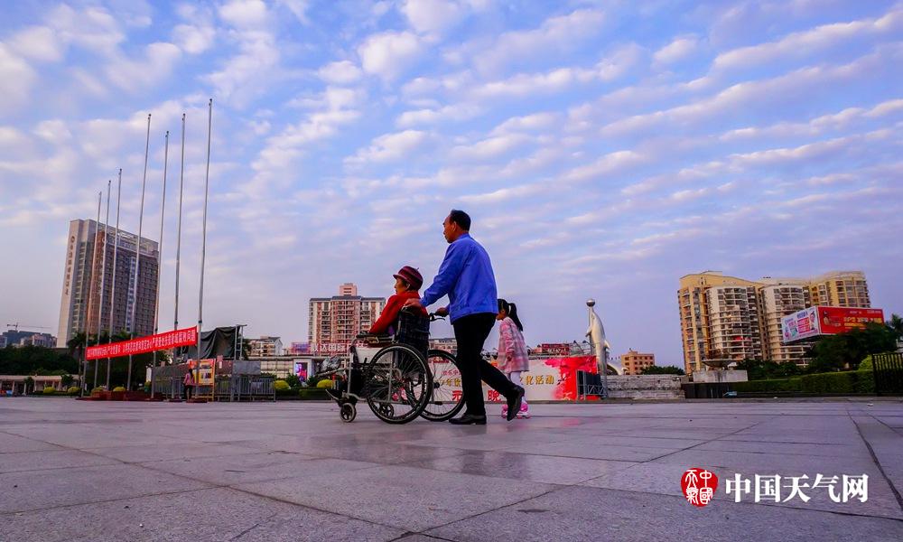 一老人用轮椅推着老伴在钦州湾广场散步。(摄影:李斌喜)