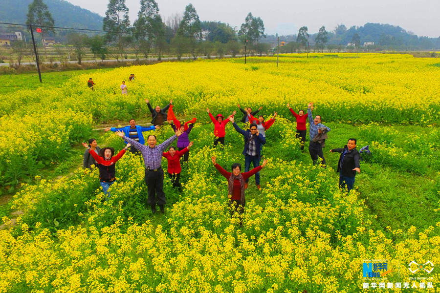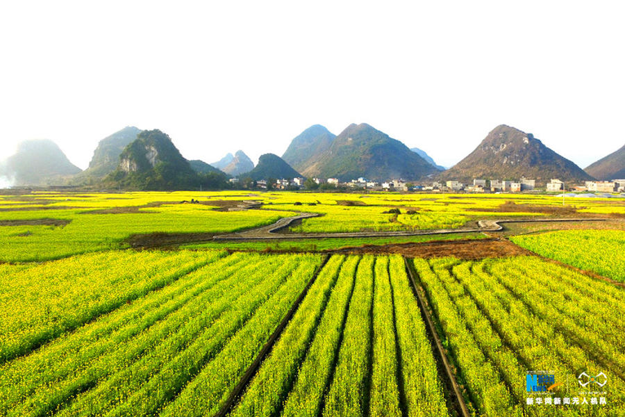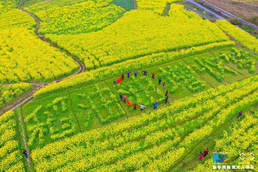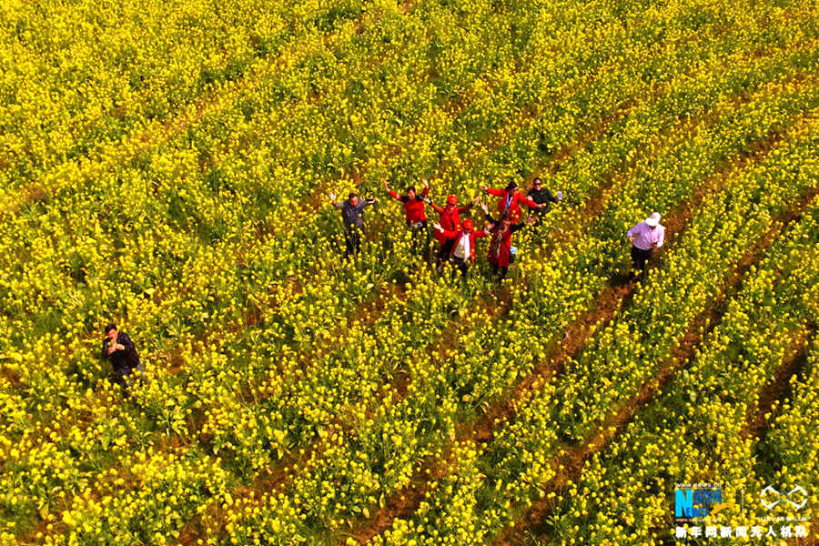 图为航拍游人2月14日在广西贺州市平桂区鹅塘镇芦岗村盛开油菜花的花田里赏花。新华网发 廖祖平摄