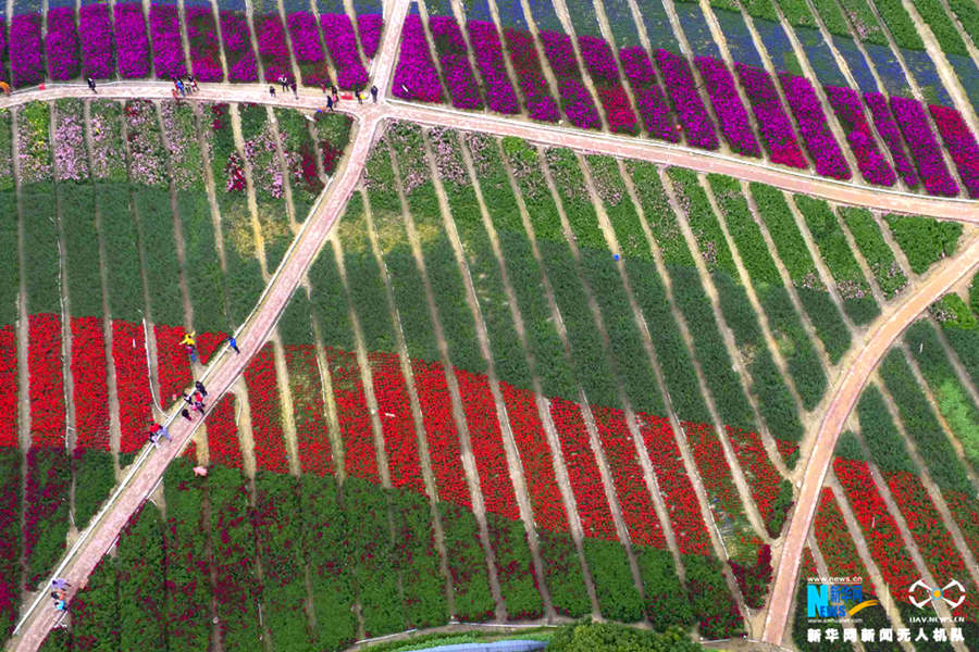 图为航拍游人在广西北流市新圩镇梧村狮子峰生态旅游景区乡村花海观赏。新华网发 刘钦明摄