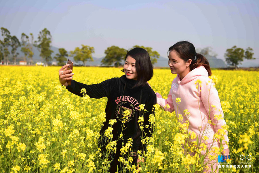2月14日,游客在广西柳州市融安县大良镇和南村油菜花田中游玩。新华网发 谭凯兴摄