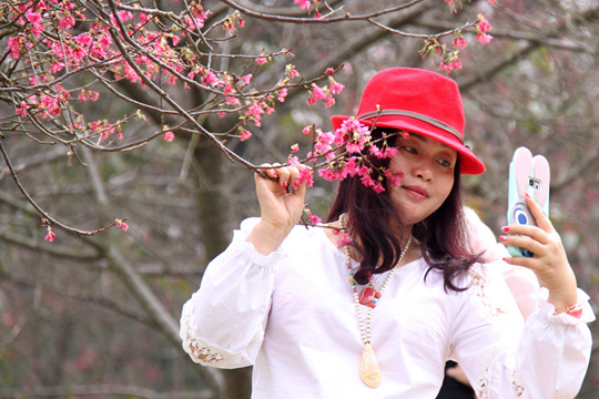 2月14日,游客在广西兴业县石南镇马塘村百八大垌村油菜花基地赏花拍照。新华网发 刘钦明摄