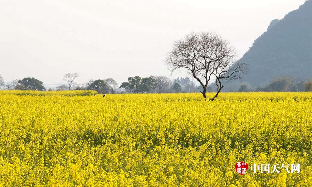 一颗枯树点缀着整片金黄的油菜花。(摄影:董州)