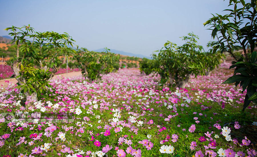 百色市右江区澄碧湖芒果产业(核心)示范区内的格桑花连片盛开,让人沉醉。广西新闻网通讯员农飘 杨宇澄 黄天成供图