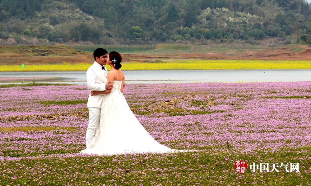 花海中情侣忙拍婚纱照。(摄影:易禹成)