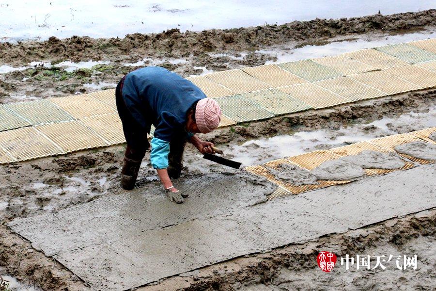 给秧盘铺泥(摄影:罗昌胜)