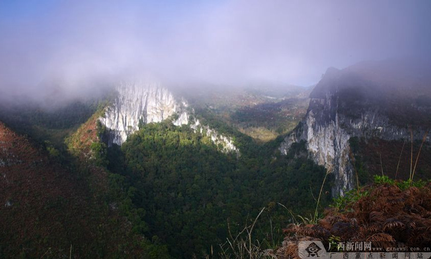 大石围天坑景区喀斯特峰丛山巅上风云变幻。(摄影:李晋)