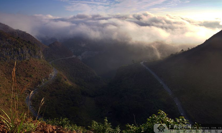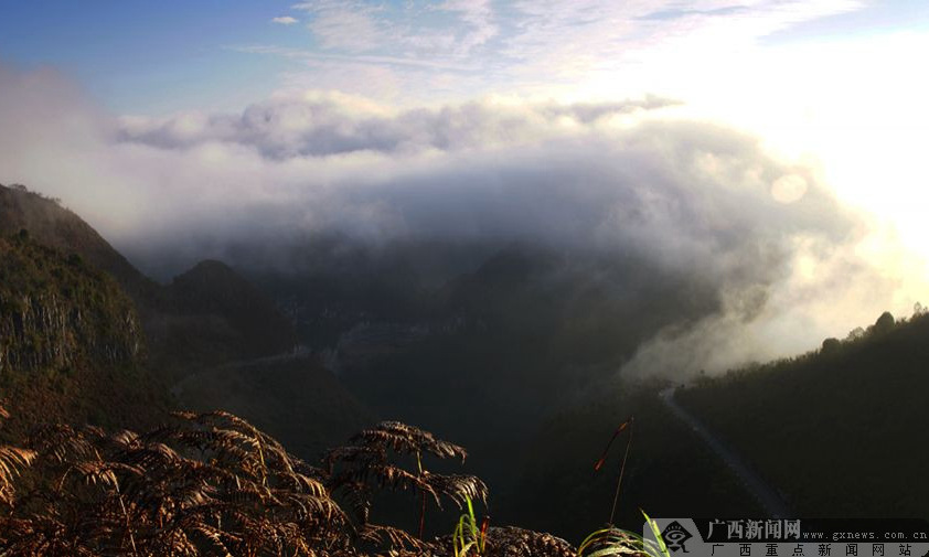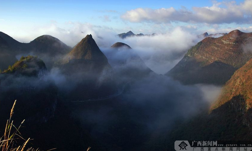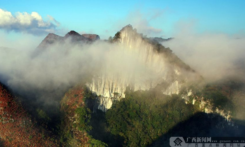 连日来的阴冷小雨滋润了大石围天坑群景区,早晨阳光令天坑周边喀斯特峰丛现山海奇观。(摄影:李晋)
