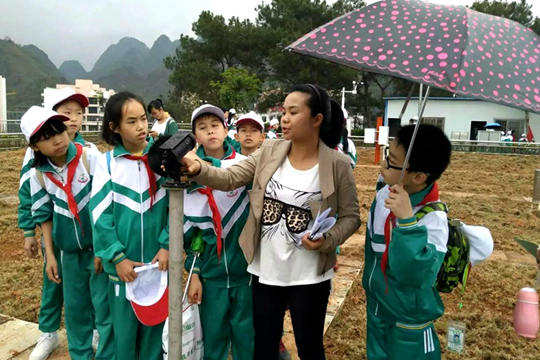 鹿寨:同学们观看人工校对雨量筒过程(摄影:马冬晨)