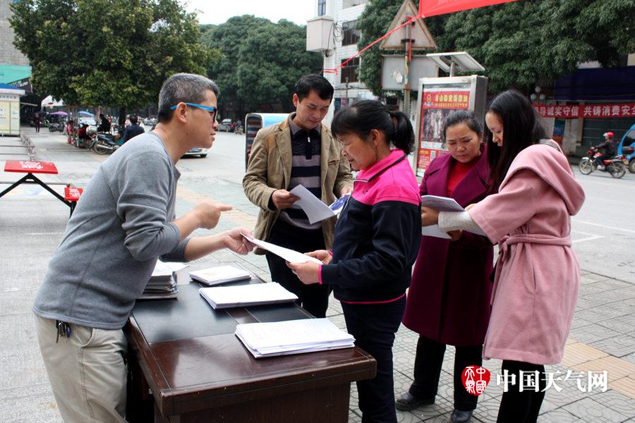 平果县气象局宣传员正在给市民发放各类气象宣传资料(摄影:韦金霖)
