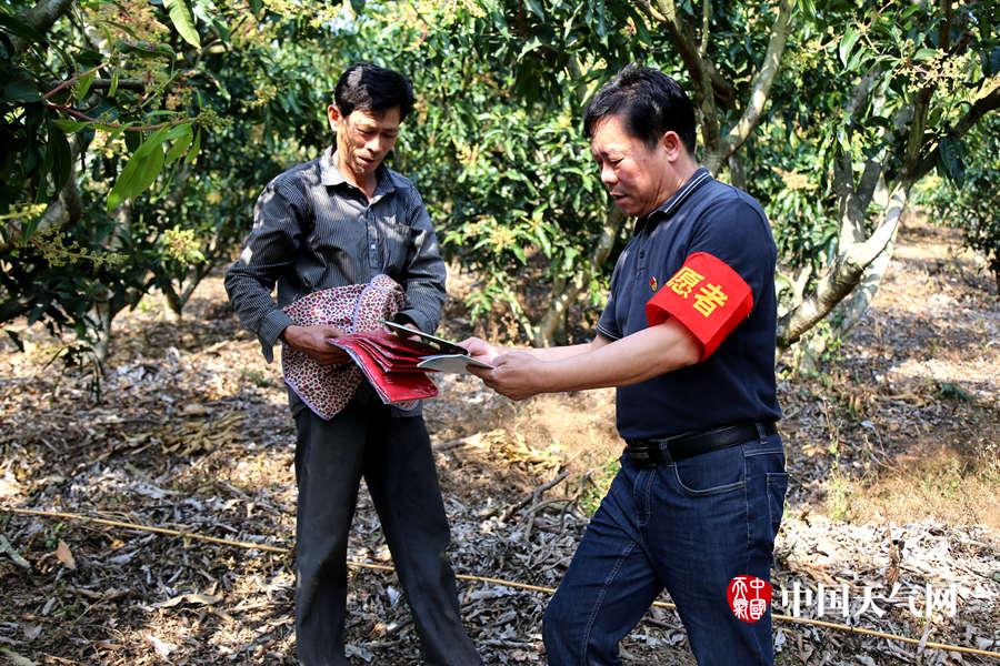 田阳的气象志愿者向果农发放气象宣传材料(摄影:王春娟)