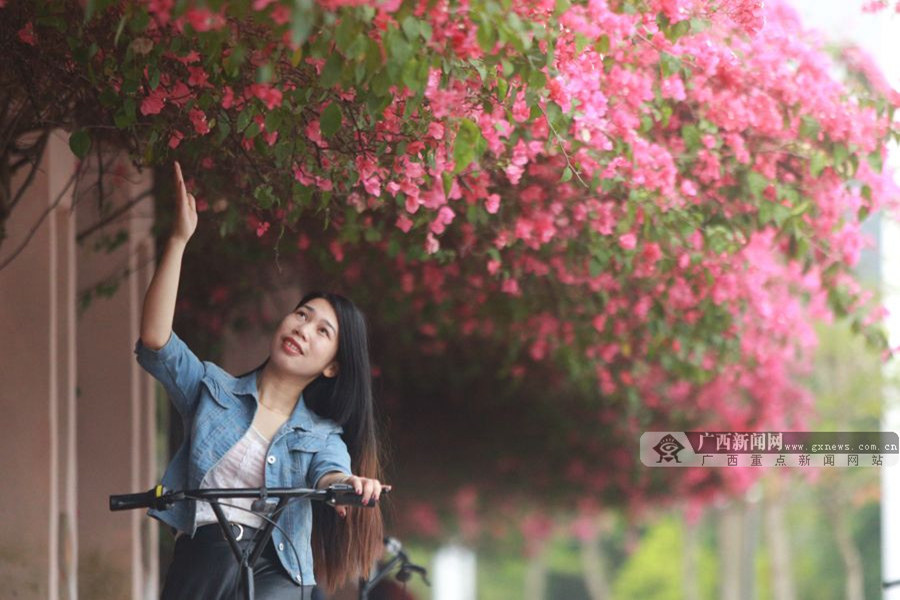 一名市民骑车经过这条“春之走廊”。 (摄影:广西新闻网记者 黄河畅)