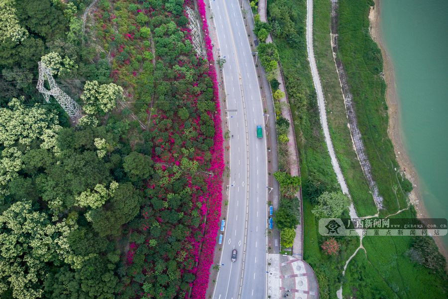 从空中俯瞰,南宁大桥与开满三角梅的青环路形成了一幅美丽的画卷。(摄影:广西新闻网记者 黄河畅)