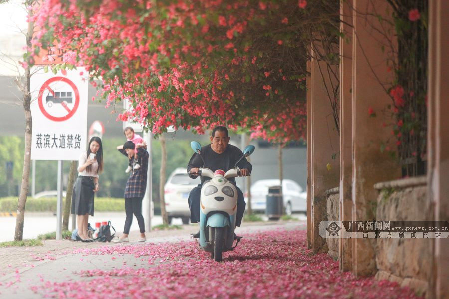 三角梅将青环路旁的人行道装扮得多姿多彩。(摄影:广西新闻网记者 黄河畅)
