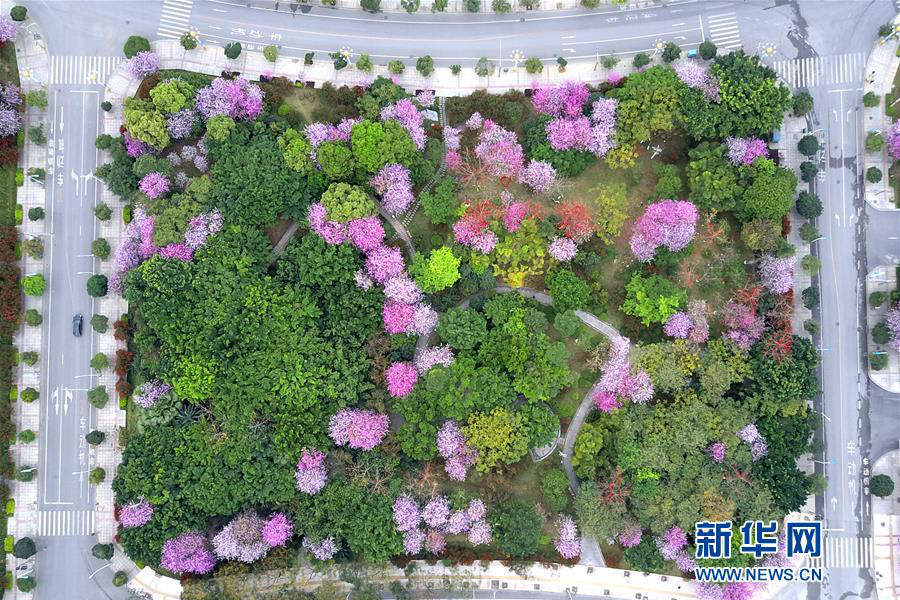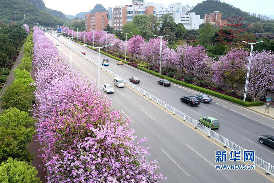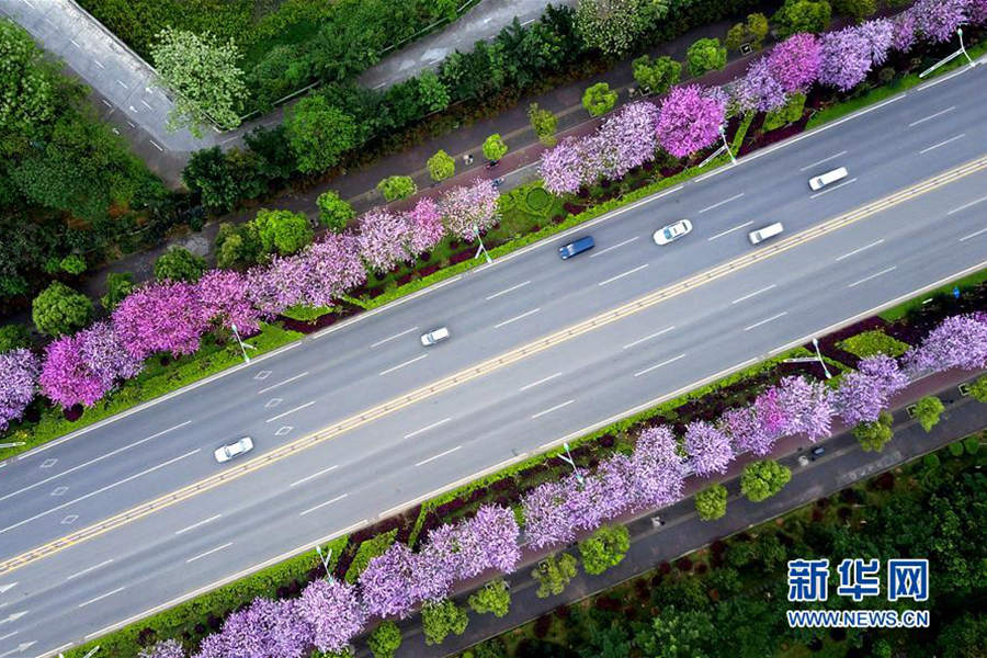 4月12日,广西柳州市区道路两侧洋紫荆花盛开。(摄影:黎寒池)