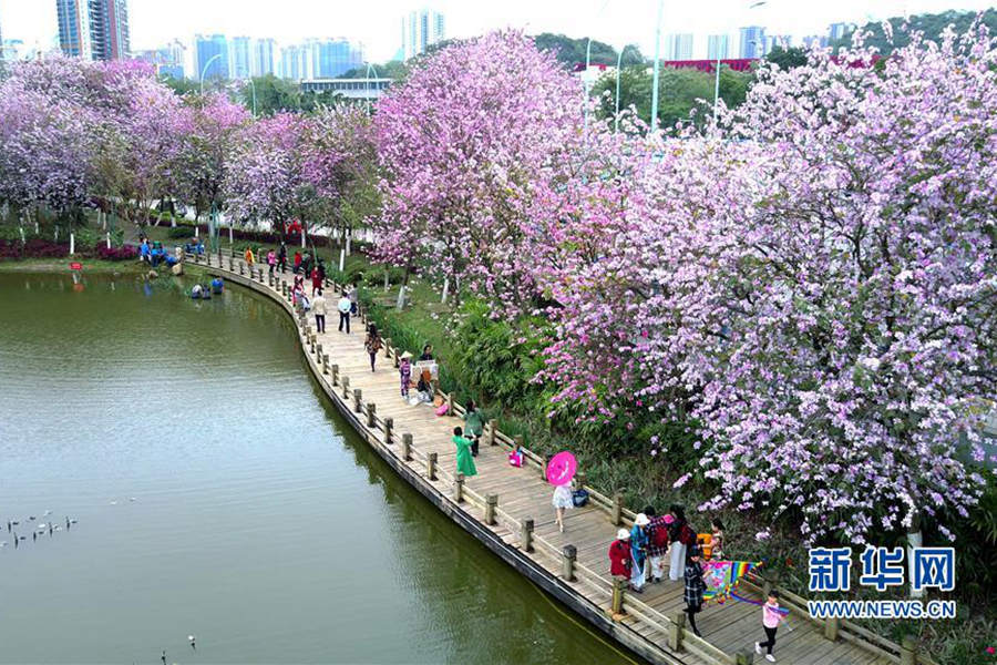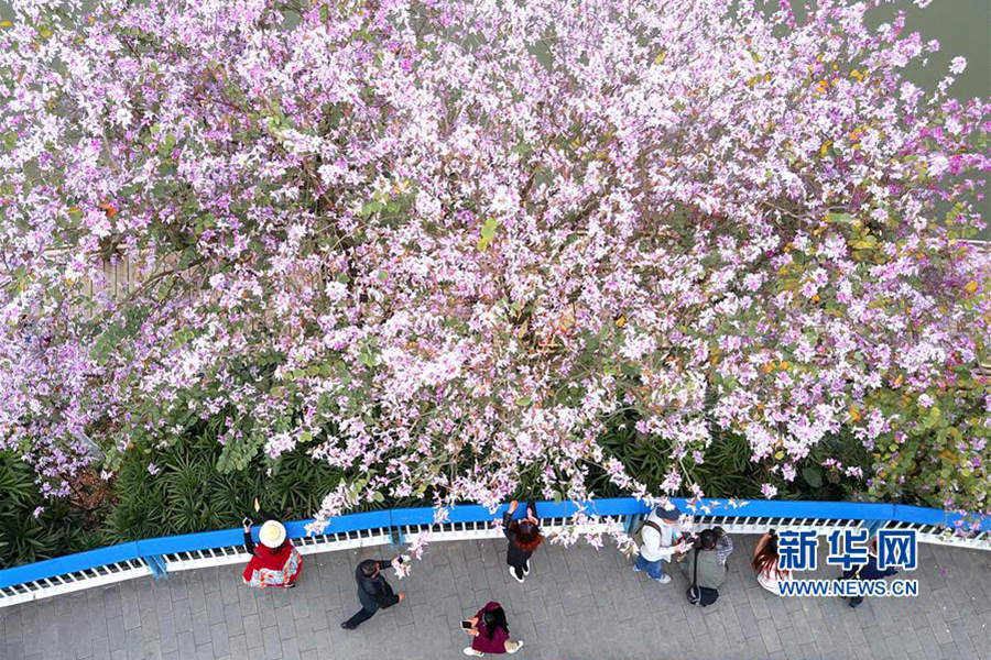 人们在广西柳州盛开的洋紫荆花下游玩。(摄影:黎寒池)