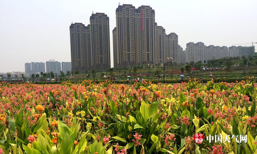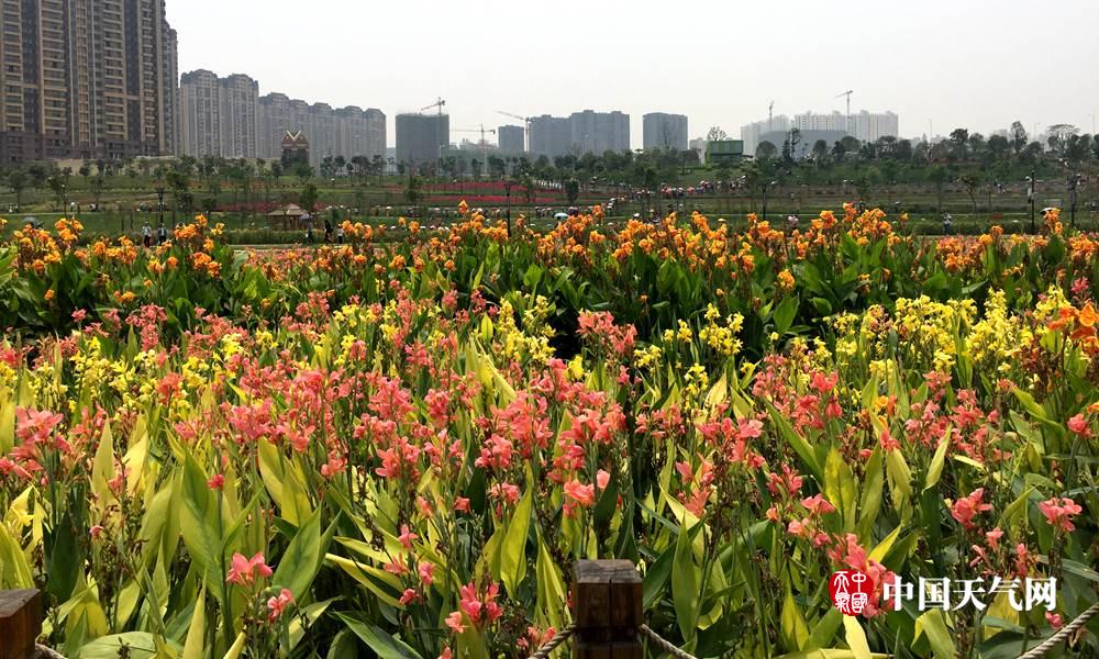 公园里成片的花海和远处的高楼构成一幅和谐的城市生态画卷。(摄影:袁丽军)