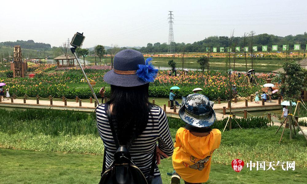 在公园游玩的母女开心地自拍留念。(摄影:袁丽军)