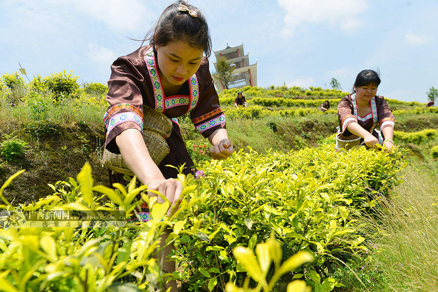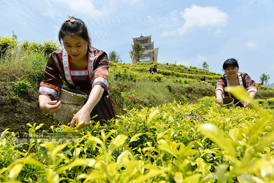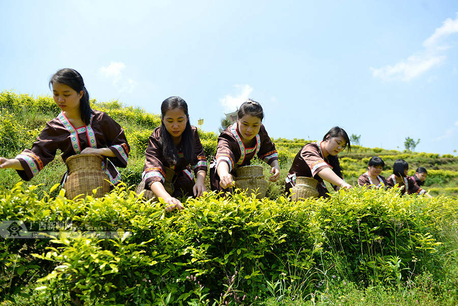 4月28日,在龙胜各族自治县乐江乡梦龙生态茶园,妇女同胞在参加采茶竞技。(摄影:潘志祥)