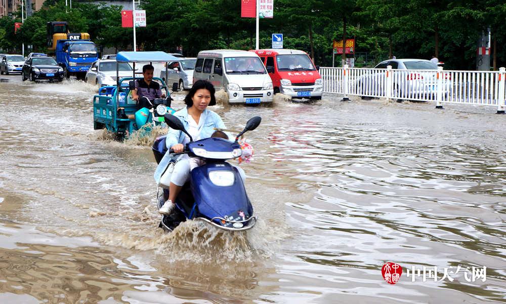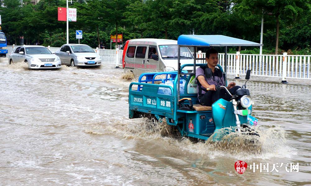车主们缓慢涉水通过积水路段(摄影:毛丽娜)