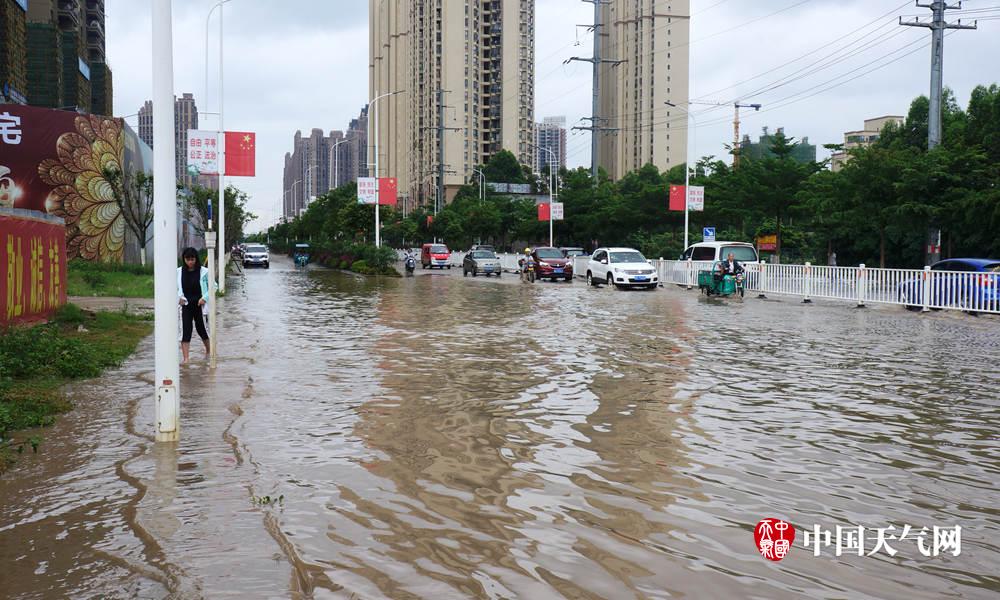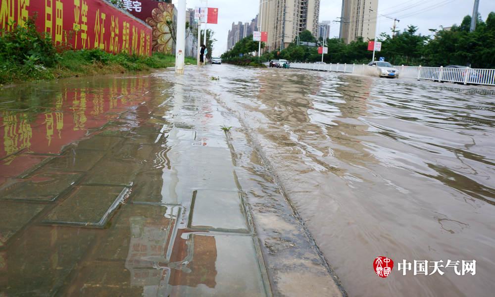 积水已经漫上道路两边的人行道(摄影:毛丽娜)