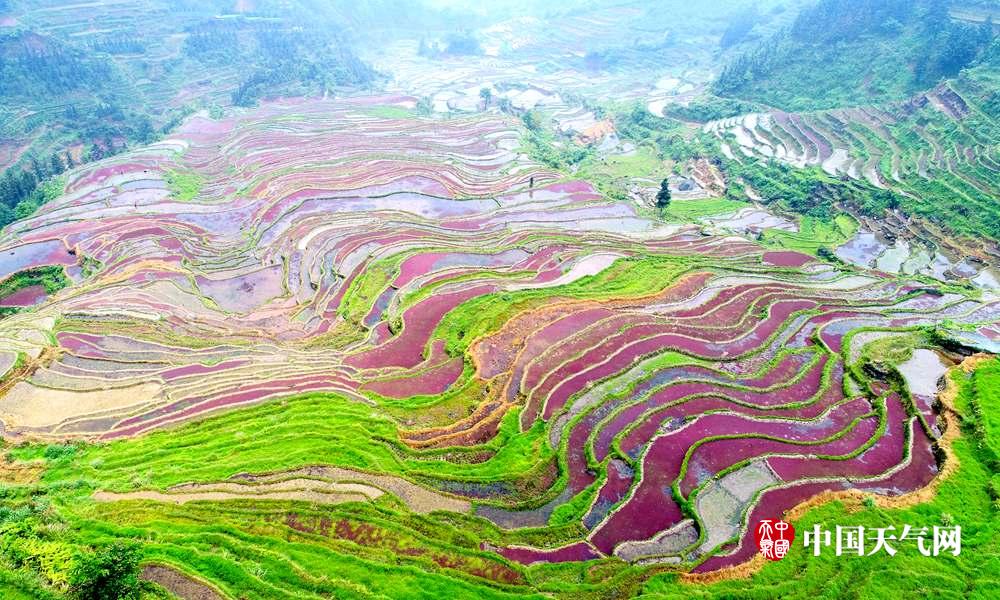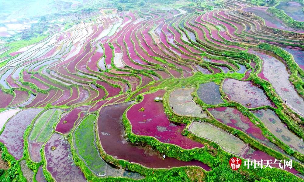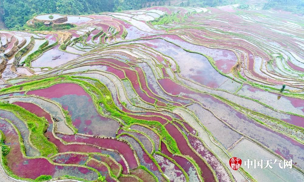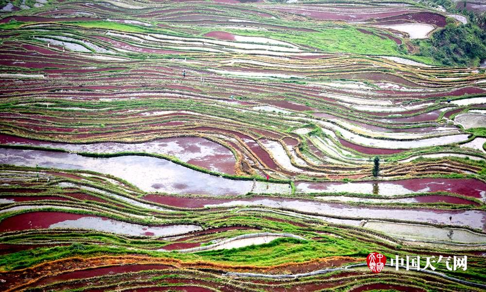 千层梯田间嫩绿小草、红色浮萍、黄色田埂等如同调色盘般五彩斑斓。(摄影:龚普康)