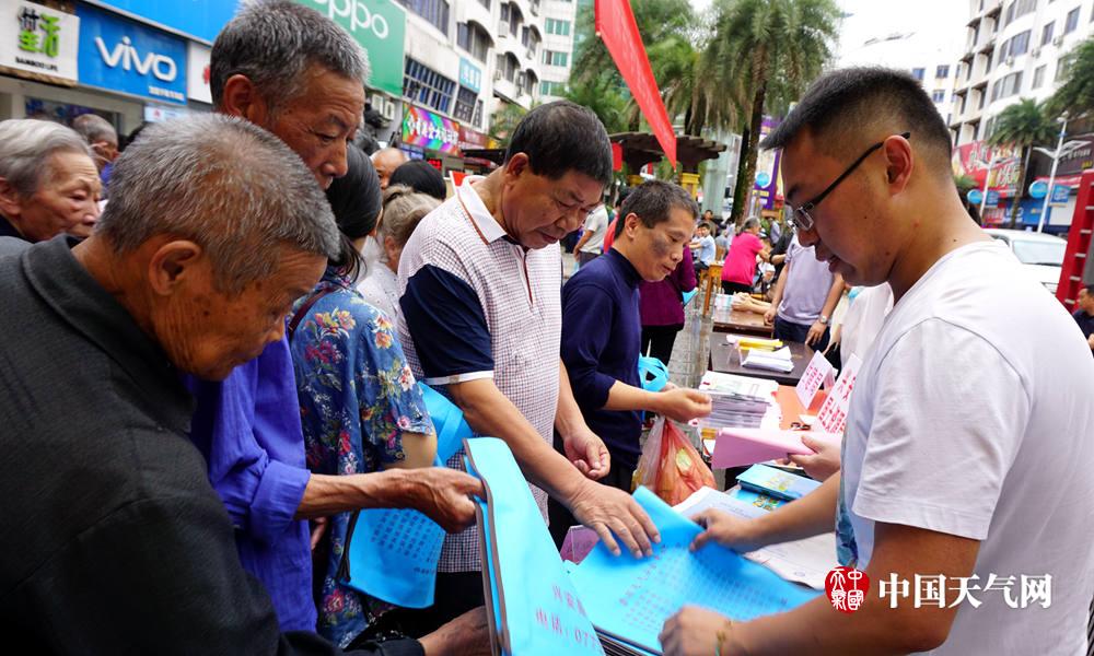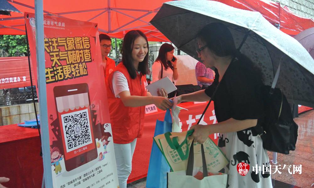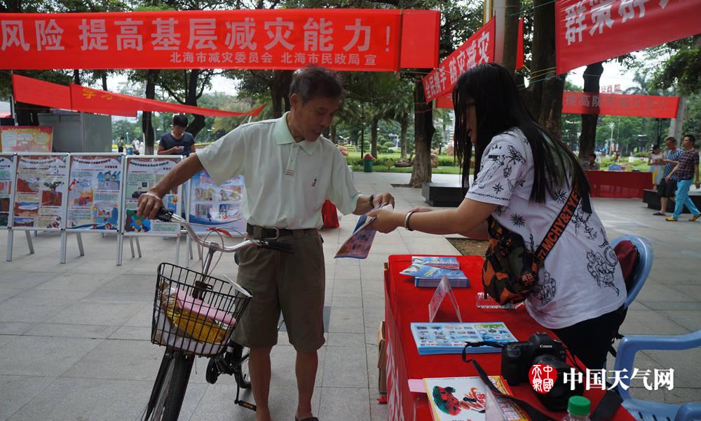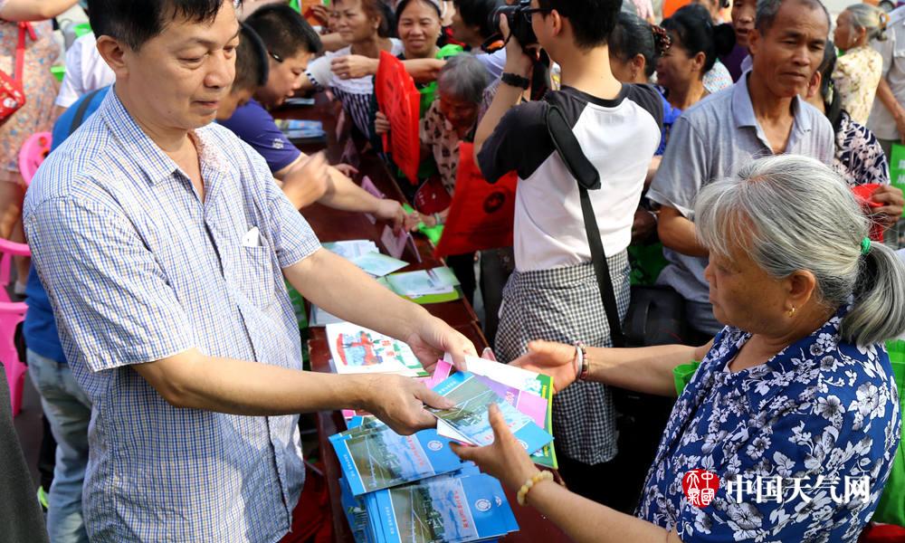 上午,防城港市气象局派出气象科普宣传小组参加活动,向广大市民发放气象防灾减灾手册、气象灾害预警信息发布指南等多种宣传材料,并向广大市民推广“防城港市气象”公众号。(文/黄春华 罗浩然)图为发放宣传材料。(摄影:唐璇)