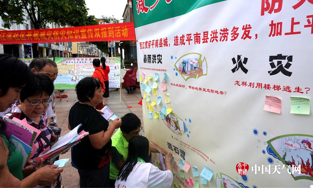 5月12日,平南县气象局联合多部门开展主题为“减轻社区灾害风险,提升基层减灾能力”的科普宣传活动。平南县局通过设立咨询台、发放科普资料等形式向市民普及气象防灾减灾知识,同时设立“防灾高手”互动平台,让市民写下自己所了解的防灾知识并粘贴到相应板块,比拼谁才是真的防灾高手。此互动平台极大地提高了市民的参与度,通过此次科普宣传活动,不仅提高了自身防灾减灾意识,更加深了对气象的了解。(文/蒋兆恒)图:平南市民踊跃参与“防灾高手”比拼(摄影:蒋兆恒)