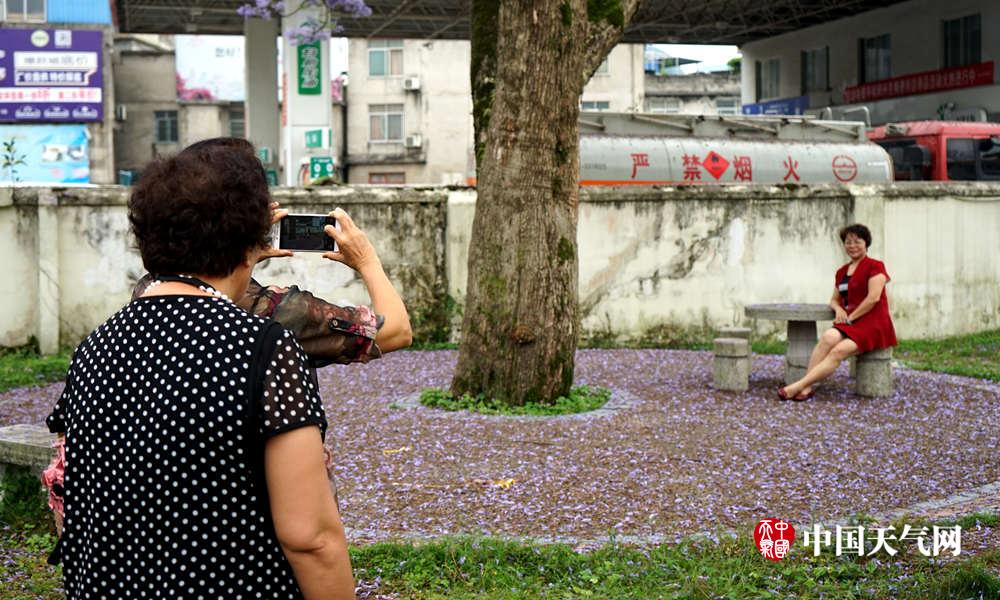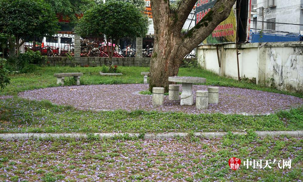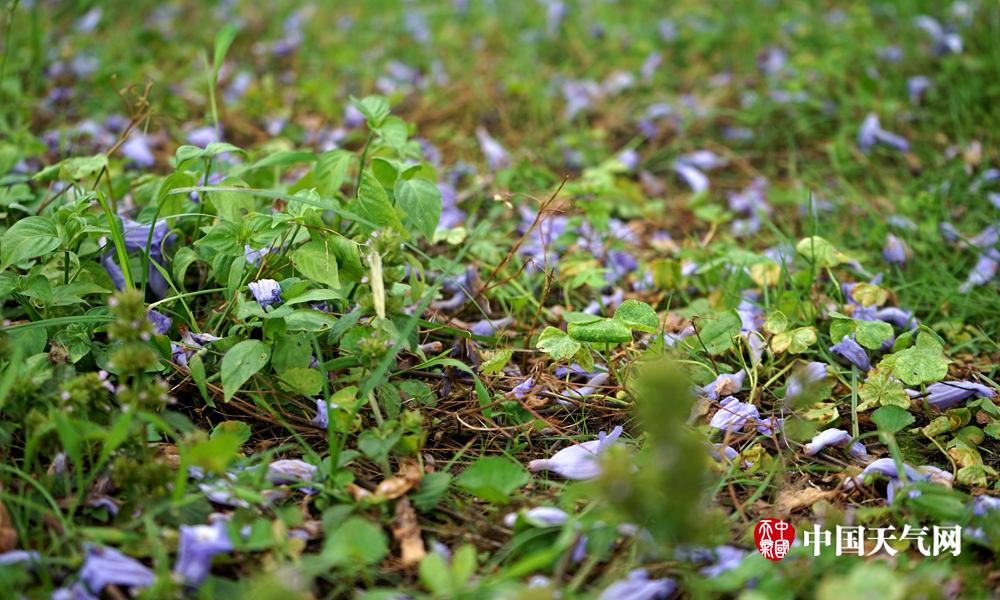 花瓣掉落在草地上,仿佛开满了紫蓝色小花。(摄影:雷晓霞)