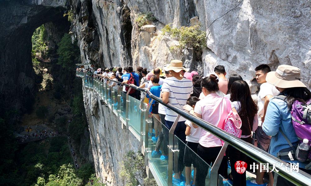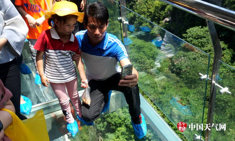 游客在玻璃栈道上拍照留念(摄影:丁灏)