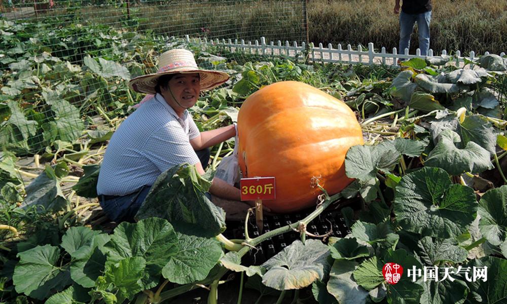 游客和百斤大南瓜开心合影。(摄影:杨健)