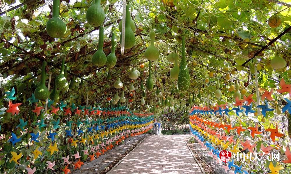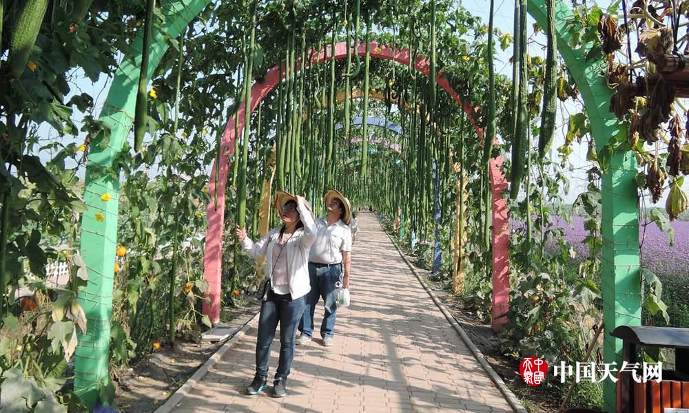 蔬菜长廊里葫芦和南瓜垂挂下来。(摄影:杨健)
