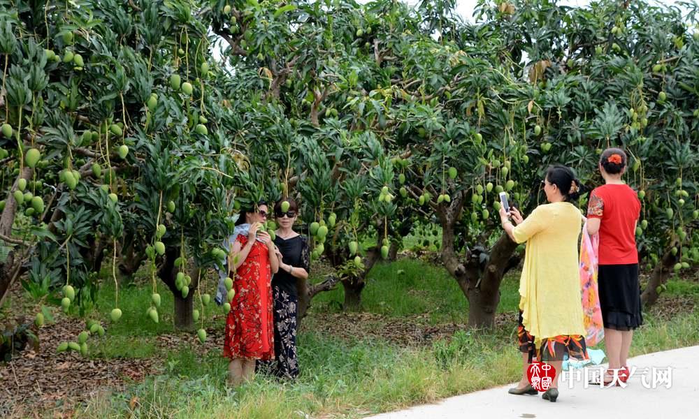 游客到芒果园里合影留念(摄影:戴雨菡)