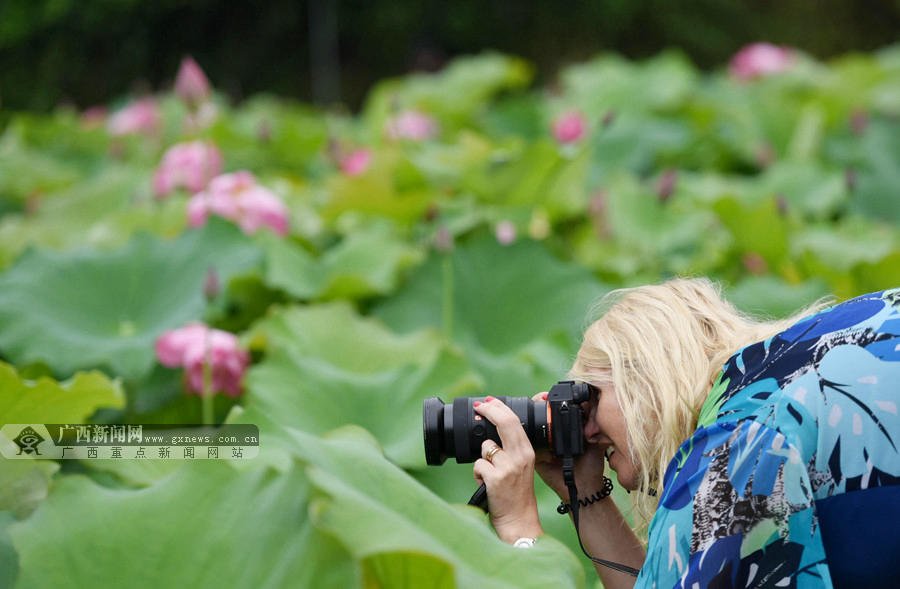 6月4日,一名外国游客在三江侗族自治县良口乡和里村荷塘拍摄荷花。(摄影:龚普康)