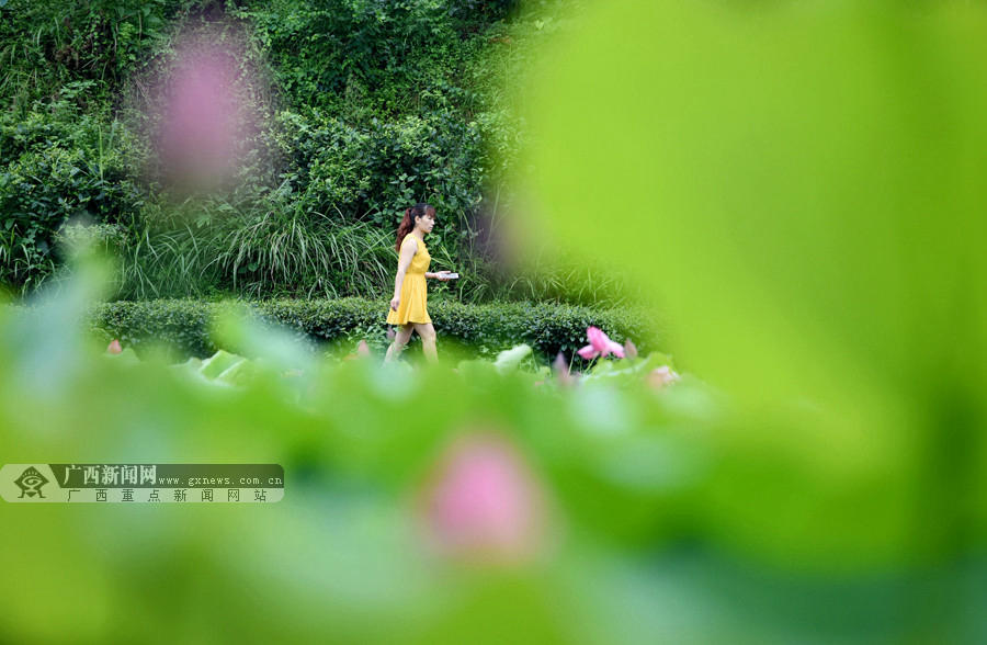 6月4日,一名游客在三江侗族自治县良口乡和里村荷塘赏花。(摄影:龚普康)